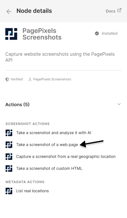 Below is a list of Actions you can perform using the PagePixels Screenshots n8n node.
