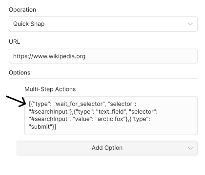 available in the "Add Options" dropdown menu to configure your screenshot (e.g. full page, wait).