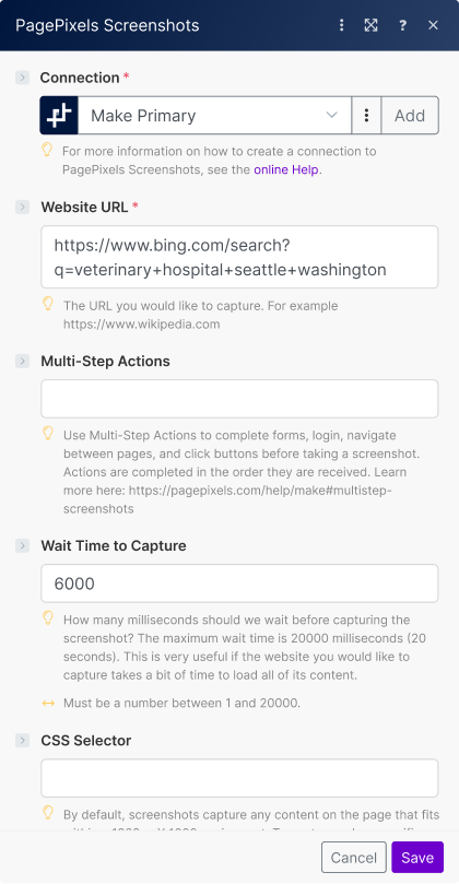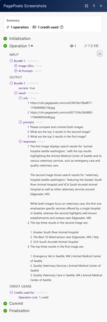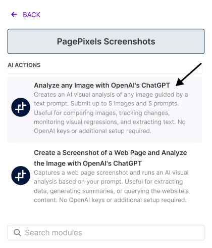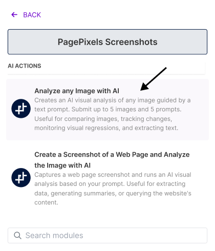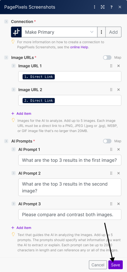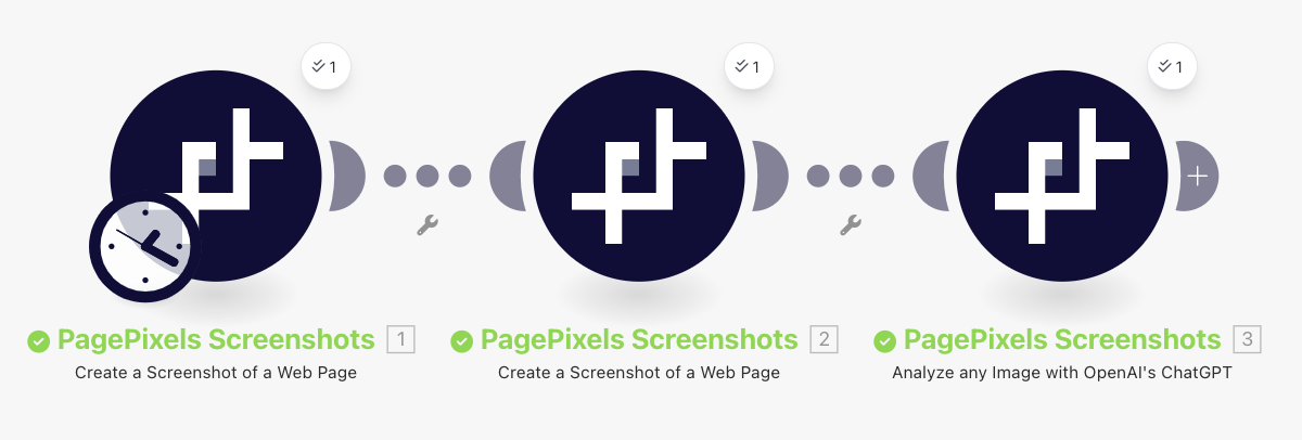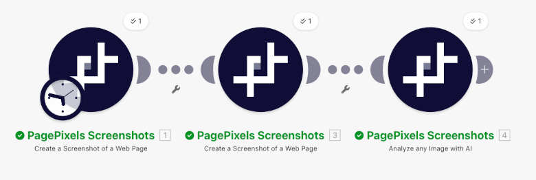 Using the PagePixels Screenshots Make app, you can automatically run AI-powered analysis on multiple images guided by your custom prompts in Make.