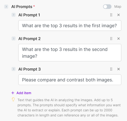 - Each prompt and each image submitted for analysis uses 1 AI Analysis Credit. The example in this tutorial uses 5 AI Analysis credits to analyze 2 images and 3 prompts.