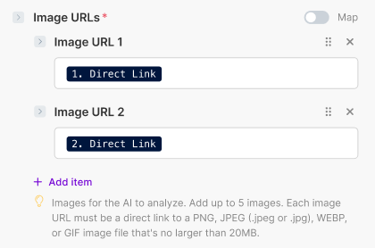 - An image can be a direct link to a screenshot or any PNG, JPEG, WEBP, or GIF image file up to 20MB in size. Image URLs can come from any app in Make.
