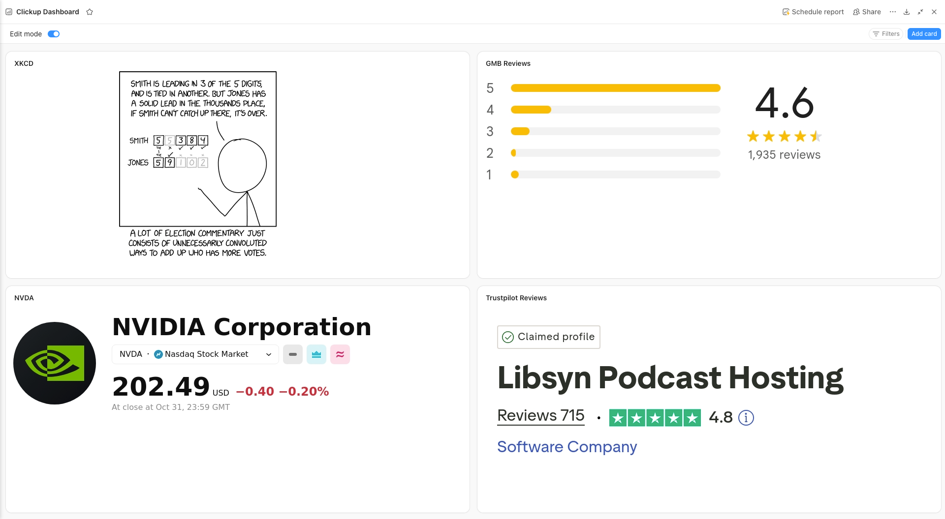 PagePixels is free to start and this tutorial demonstrates how you can take daily screenshots of a random XKCD comic and display the image in your ClickUp dashboard.