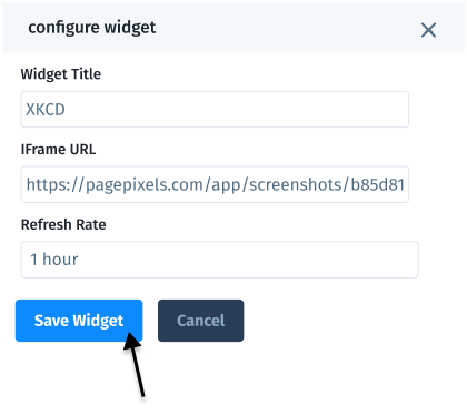 PagePixels is a screenshot automation tool that you can use to take automatic screenshots and dynamically display the latest image in a website or web app, including Cyfe dashboards.