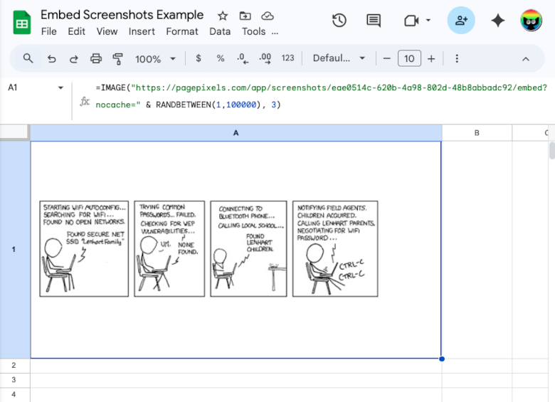 PagePixels is free to start and this tutorial demonstrates how you can take daily screenshots of a random XKCD comic and display the image in a Google Sheet cell.