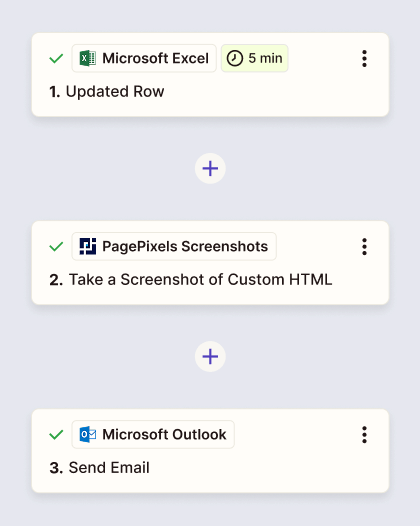 With the PagePixels Screenshots Zapier app, you can convert data from thousands of apps in Zapier into screenshots, including your Excel data.