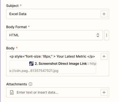 To accomplish this, you can use PagePixels' Take a Screenshot of Custom HTML Action in Zapier. This Action accepts data from one or more apps that you wrap in HTML tags to create a custom screenshot.