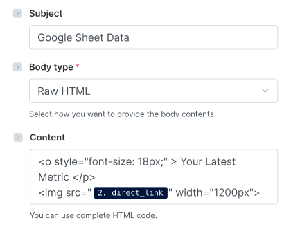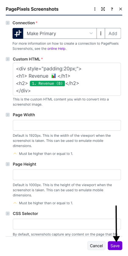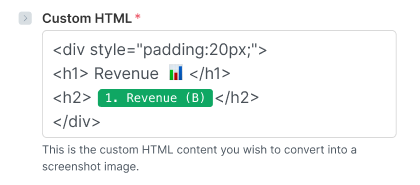 To accomplish this, you can use PagePixels' Create a Screenshot from Custom HTML Action in Make. This Action accepts data from one or more apps that you wrap in HTML tags to create a custom screenshot.