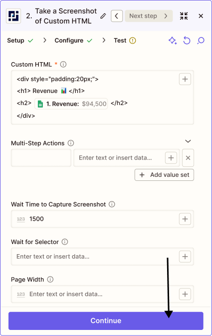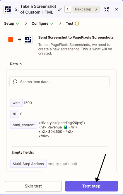 To accomplish this, you can use PagePixels' Take a Screenshot of Custom HTML Action in Zapier. This Action accepts data from one or more apps that you wrap in HTML tags to create a custom screenshot.