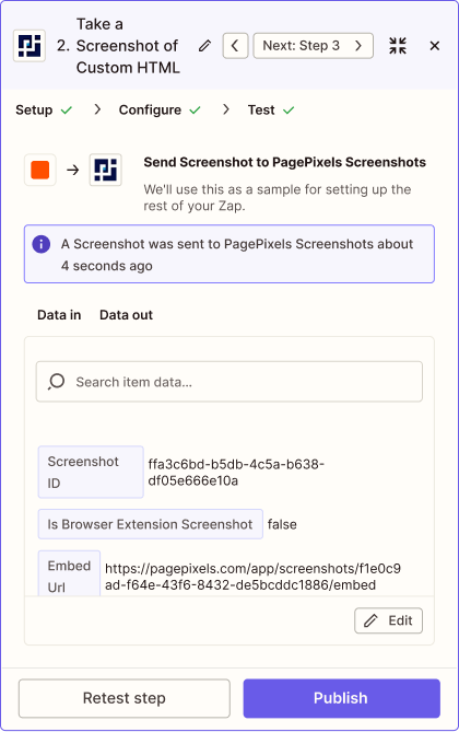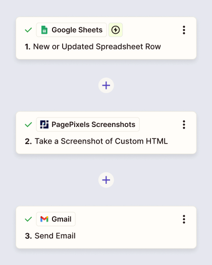 With the PagePixels Screenshots Zapier app, you can convert data from thousands of apps in Zapier into screenshots, including your Google Sheets data.