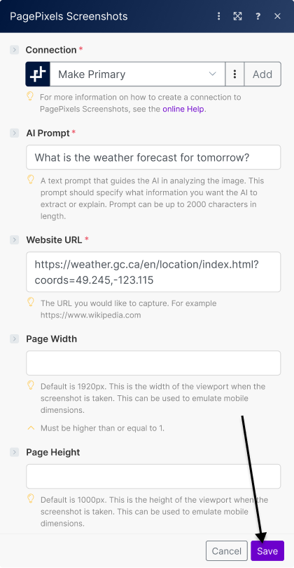 As an example, this tutorial demonstrates how to automate daily AI analysis screenshots of weather information and email the AI analysis results using Make's Gmail integration.