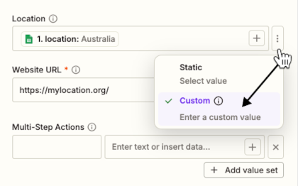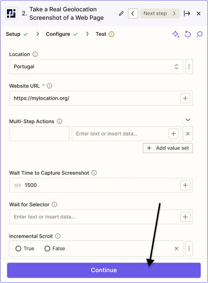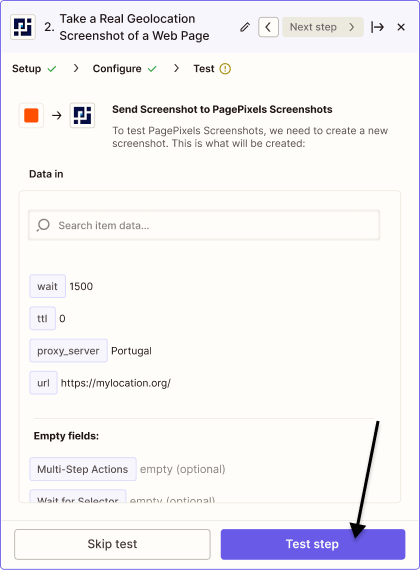 You can simply choose your desired location in the Zapier app. No proxy server setup required, and all PagePixels accounts get 32 MBs Real Location bandwidth for free per month.