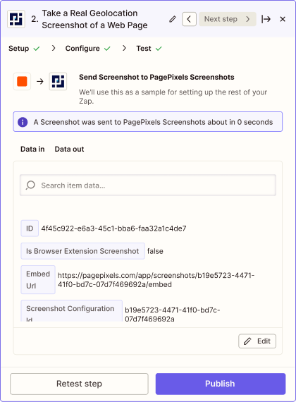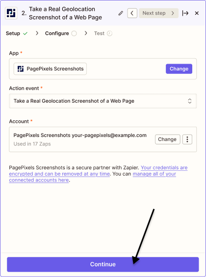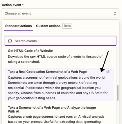 To access Real Locations in Zapier, you can use the PagePixels Screenshots Take a Real Geolocation Screenshot of a Web Page Action app event in Zapier.